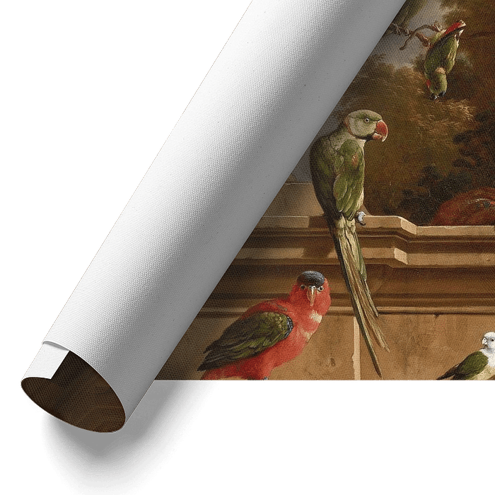 The Menagerie, Melchior d'Hondecoeter. A painting with a diversity of animals such as squirrel monkeys, cockatoos, parrots and other beautiful birds. Originally this painting hung in Paleis het Loo.