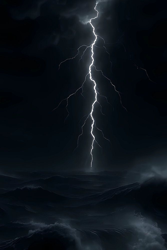 Description : A moment of pure, raw primal power captured. A single, bright bolt of lightning rips through the dark night sky, illuminating for a moment the raging waves of the sea below.