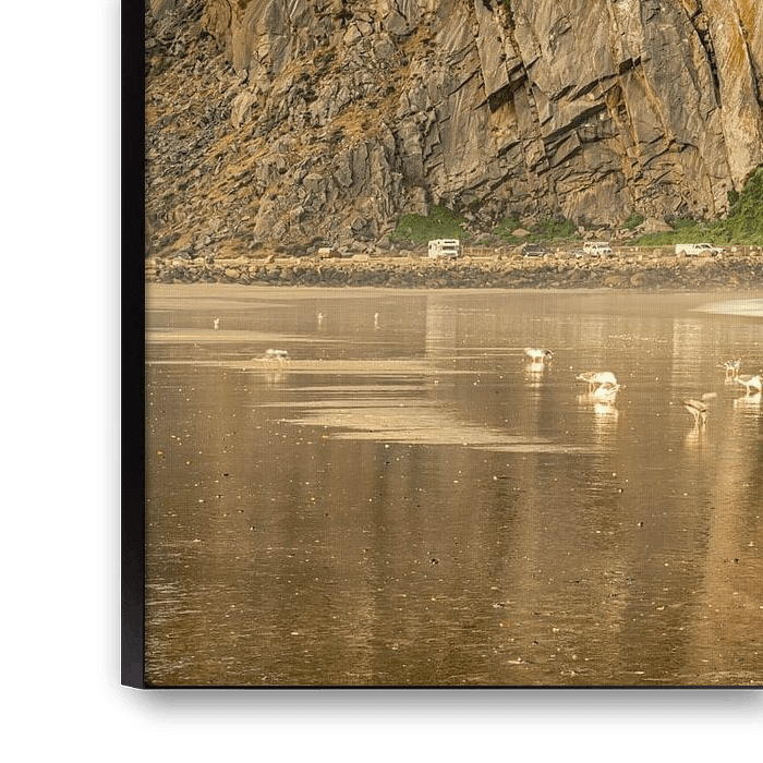 A towering, rugged rock formation stands majestically on a tranquil beach, with birds wading in the reflective shallow waters in the foreground. The scene is enveloped in an overcast sky, casting a soft, diffused light over the landscape.