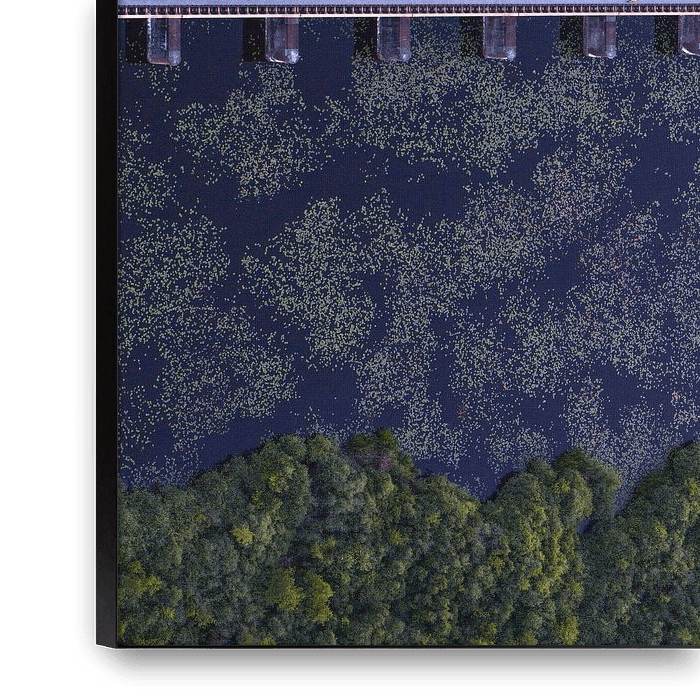 From the air, an almost graphic landscape unfolds around the iconic Moerputten Bridge. The long railway bridge cuts through the dark water like a straight line, surrounded by floating water plants and densely overgrown banks. The contrast between the geometric lines of the bridge and the organic forms of nature creates a powerful and…