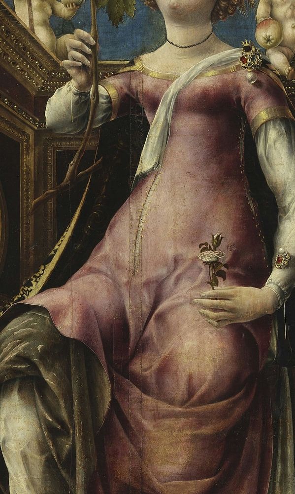 The surviving text reveals that here we see Thalia, who is shown in the role of the muse of agriculture rather than the patroness of comedy. This is indicated by the motto at the bottom of the picture ('I taught man to plant'), and also the mature ears of wheat surrounding Thalia's head, the bunch of grapes in her hand, and the luxuriant fruit surrounding her throne. Her pregnant state, unusual for the muses, further reinforces the idea of fertility.