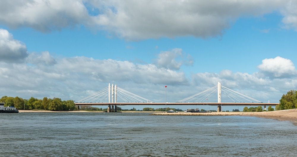 The Tacitus bridge is a cable-stayed bridge that was built from 2011 to 2013 next to the already existing, four-linked, Bridge at Ewijk. Together they form the shore connection by which the motorway A50 crosses the river Waal. The bridge is located between the Ewijk and Valburg interchanges.