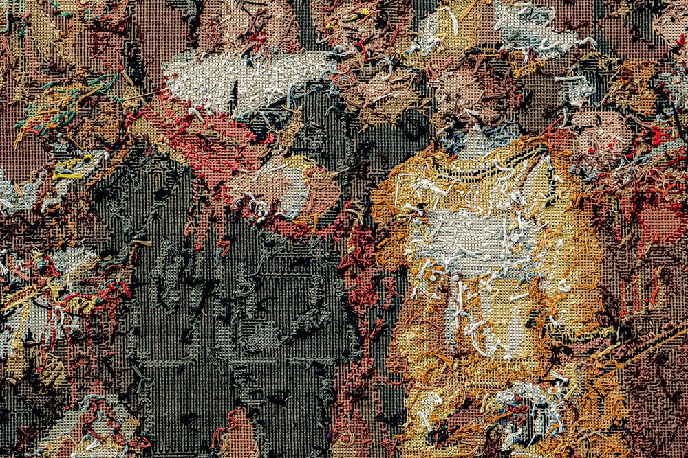 If you look closely, you can see that this picture is the back of the Night Watch. You can see the threads of the embroidery. With a golden frame this picture looks funny, but also on canvas it is a real eyecatcher in your living room or office.