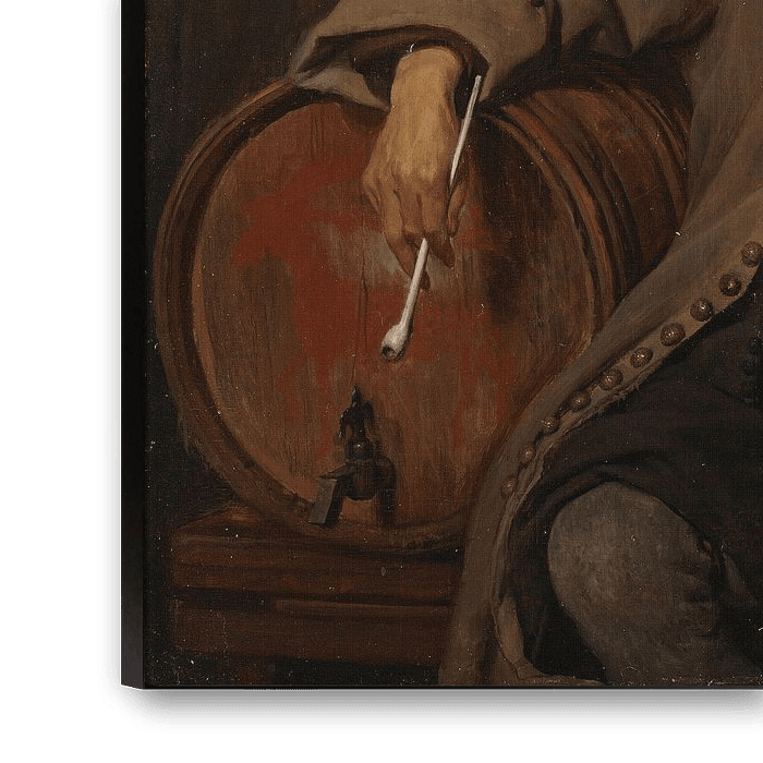 This old man holding a beer tankard looks out at us somewhat drowsily. The tally of the drinks he has consumed is chalked up on the slate behind him. The beer barrel at the left bears the mark of Het Rode Hert (The Red Hart), an Amsterdam brewery on the Prinsengracht. Metsu was living next door to it around 1650.