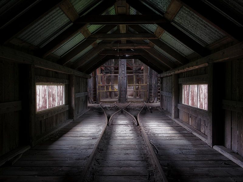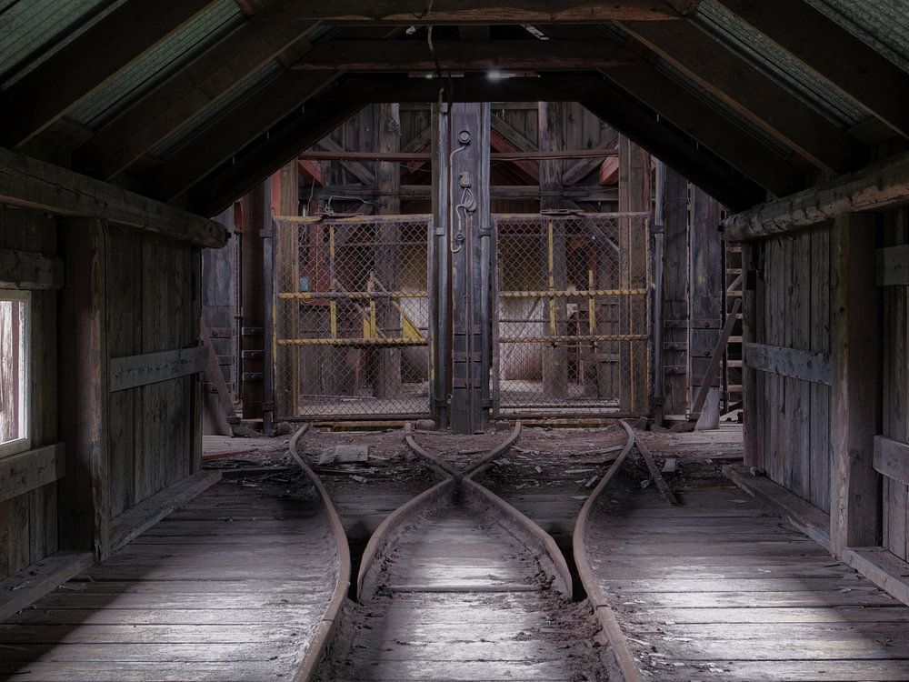Colour photograph of two tracks of mining carts leading to a lift in an old and abandoned iron mine.