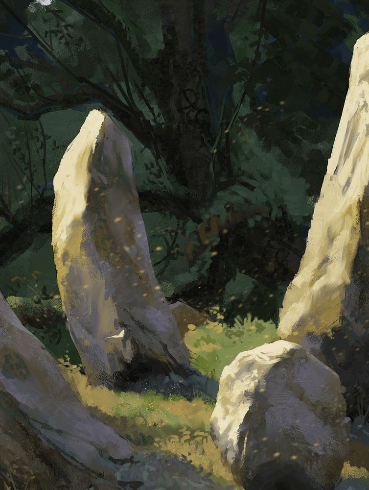 Deep in the ancient forest there lies a hill. An ancient sacred place. Large mossy stones are now the only evidence of what must once have been a magical place. Will you step out of the shade of the trees to climb the overgrown steps, in search of the mystery of the ancient standing stones.