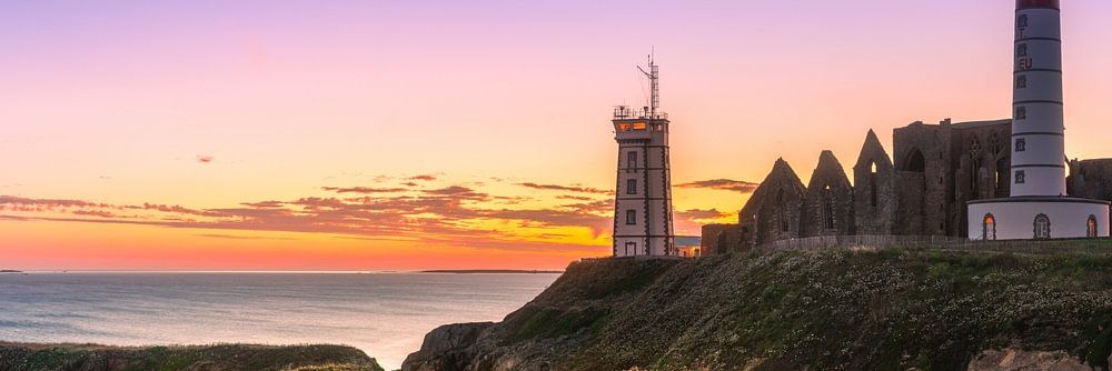 The sunsets on the Atlantic coast of Brittany are some of the most beautiful you can admire in France. Here at the Saint Mathieu lighthouse, the sun sets in June and July directly behind the beautiful lighthouse ensemble