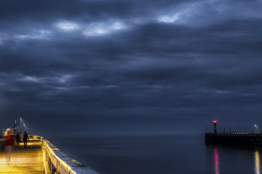 After sunset , on the Nieuwpoort-bad pier. The blue hour with a beautiful dramatic cloud carpet and just stopped raining. It does not stop people from enjoying a quiet late evening walk on the pier....
