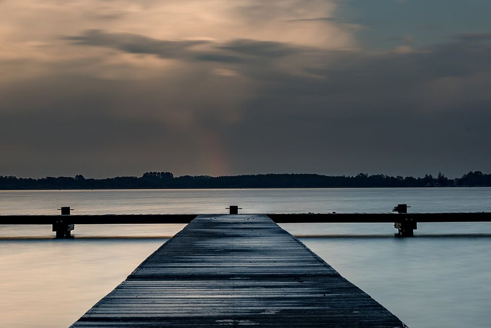 A simple image of a pier in the Netherlands. Symmetrical with warm and cold colours.