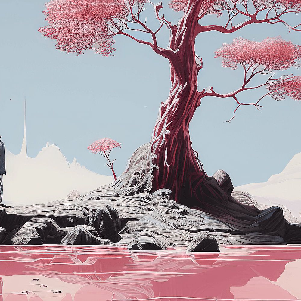 A surreal image of a pink tree on an island in a pink sea with a person standing on the island. The image evokes a sense of isolation and mystery.