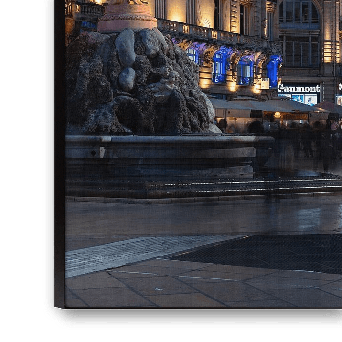 Montpellier, Occitanie, France, 12 28 2022 - People around the statue at the Place de la Comedie, the Comedy Square by night