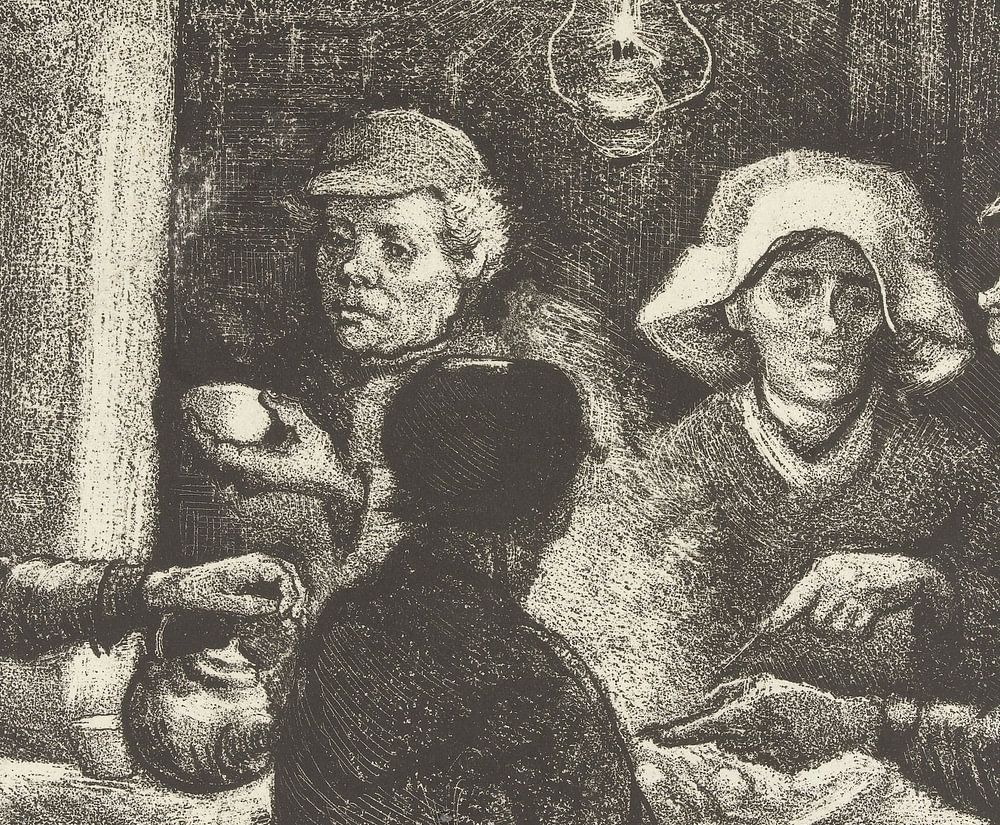 Lithographic version of Van Gogh's 'Potato Eaters': a peasant family around a table, lit by an oil lamp, eating potatoes from a bowl.