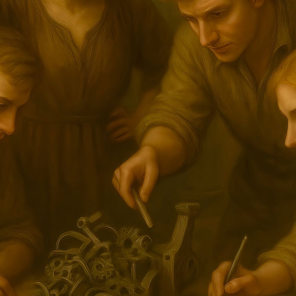 A group considers individual mechanical parts on the table. One person draws, another points, and the rest think with concentration. Their attention is sharp and collaborative. This work shows the process of thinking together in complex situations. The Problem Solvers represents analytical teamwork, practical thinking skills and the creative will to make something working.