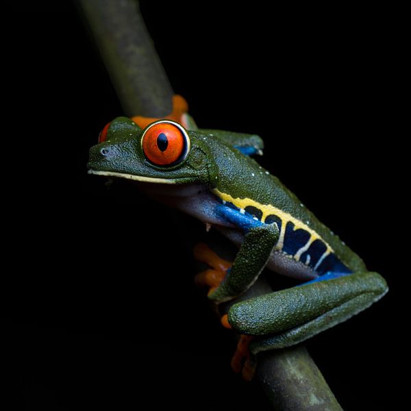 A nocturnal tree frog photographed in the evening during one of my many journeys through the rainforests of Costa Rica, distinguished by its vivid red eyes and vibrant green body.