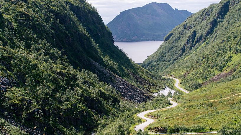 A winding mountain road cuts through a green valley, leading the eye towards the water and mountains in the distance. The harsh light of a clear day emphasises the shapes of the landscape, while depth and layering bring calm to the image.