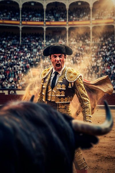 A fierce matador stands locked in a high-stakes confrontation with a bull inside a sunlit arena. Swirling dust clouds surround him as he lets out a powerful, adrenaline-fueled roar. The blurred crowd in the background highlights the intense isolation of the two combatants. It is a dramatic snapshot of tradition, danger, and unbridled…