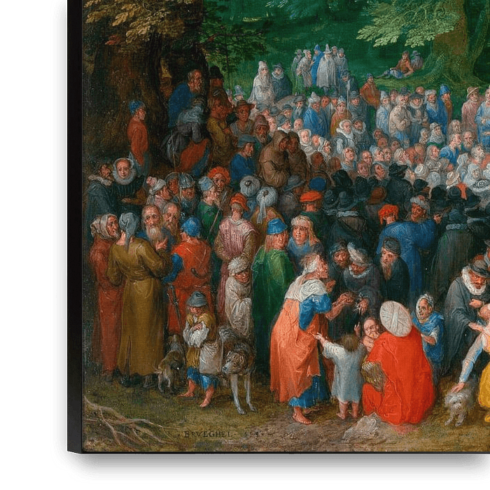In this small painting, the figure of Christ is almost lost amid the dense, multi-colored crowd. Identified by a pale yellow halo, Christ stands on a rustic podium near the crowd's center. He presents his sermon on the conditions of blessedness. Behind Christ, his disciples pay rapt attention, but many in the diverse throng prefer to socialize with one another. In the foreground , a gnarled gypsy tells fortunes and a vendor sells pretzels. To the right, below a distant vista, a man in a long coat and dark hat directs two women in elegant gowns toward the crowd. Jan Brueghel the Elder painted this festive scene on a thin sheet of copper. The work's bright colors, fine details, and enamel-like finish are accentuated by the hard copper support. Brueghel's unmatched ability to describe figures and landscape in great detail transforms the painting into a jewel-like object intended for close scrutiny.