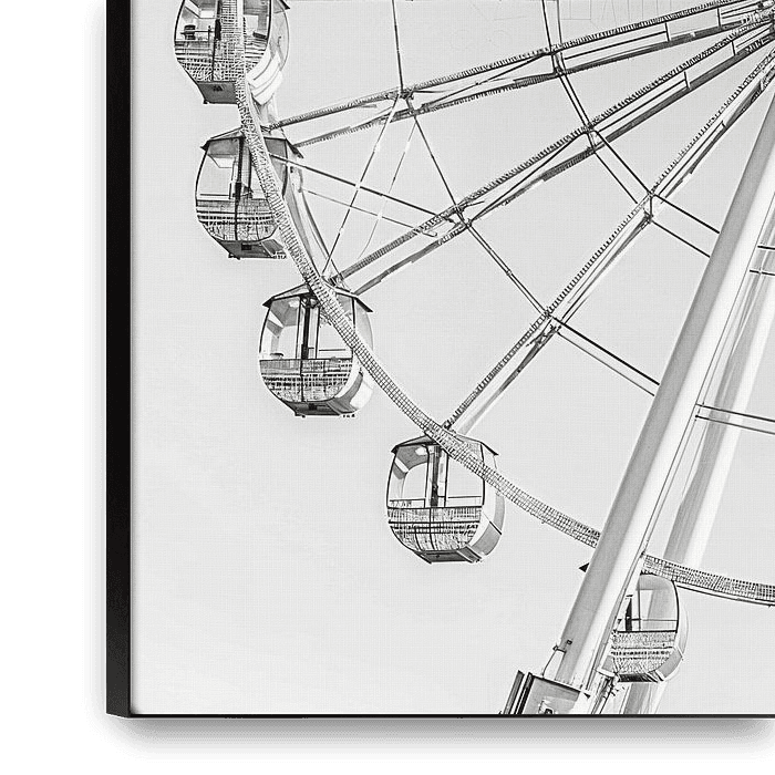 A minimalist image of the Ferris wheel against a bright background, where the simple composition and use of light and shadow emphasise the shape and structure of the iconic structure.