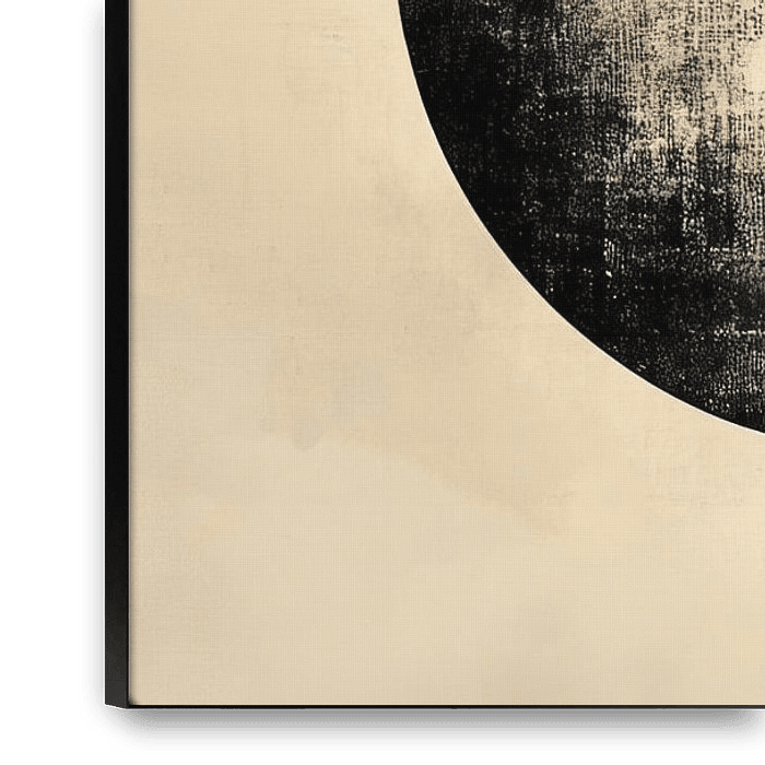 This artwork depicts a large, almost complete circle positioned on the left side of the image. The circle has a clearly visible texture, with irregular transitions between dark and light areas, giving the surface a weathered and layered character.