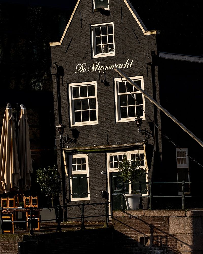 A characteristic image of Café De Sluyswacht, a former lockkeeper's house from 1695, contrasts beautifully with the modern architecture in the background. The combination of historical heritage and contemporary elements captures Amsterdam's unique charm. The warm sunlight highlighting the café's facade gives it an intimate and inviting atmosphere.