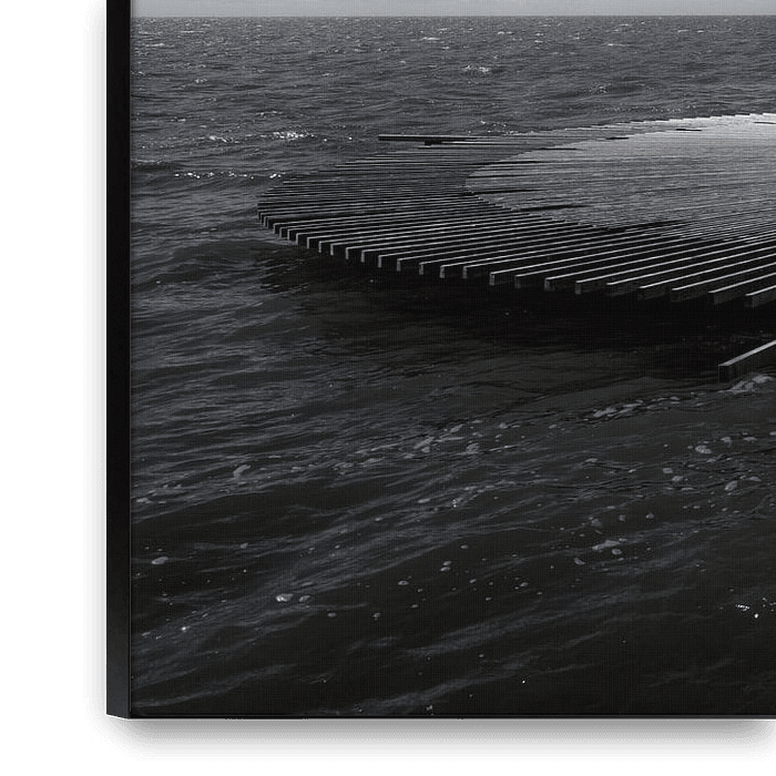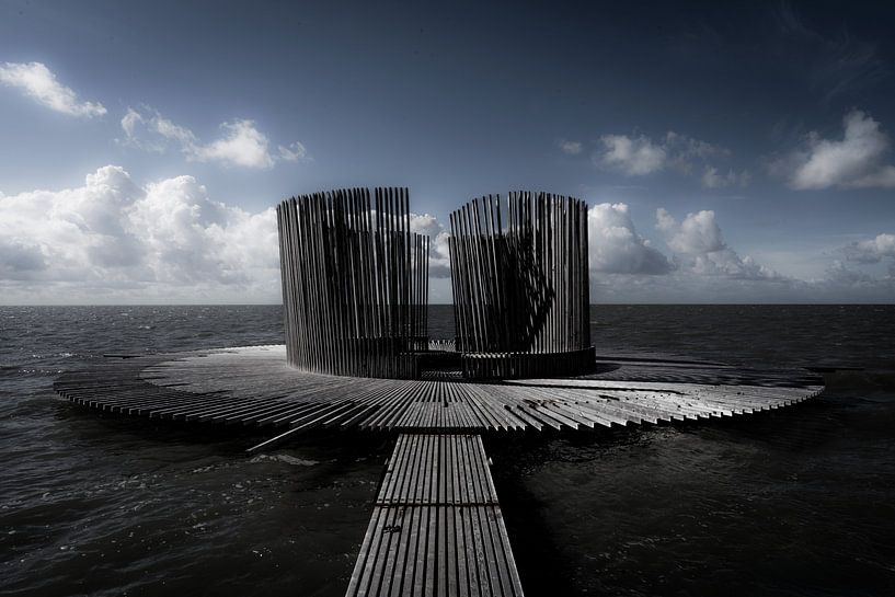 Landscape artwork by Marc van Vliet constructed on the dike near Oosterend on Terschelling. The artwork is made entirely of wood and moves with the tides. The artwork is accessible via a 150-metre-long footbridge. This installation on the mud flats moves with the tides due to the forces of the moon.