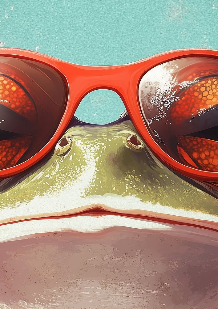 An adorable illustration of a frog wearing striking red glasses, set against a turquoise background. The drawing is rich in highly detailed elements, with the glasses depicted sharp and clear, and the frog showing human features, making the expression vivid and engaging. The vibrant colours of the glasses contrast nicely with the calming tones of the turquoise background, creating a playful yet harmonious whole.