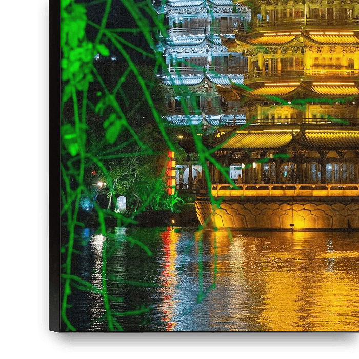 The two famous pagodas on Shan lake are bathed in two colours of light in the evening, symbolising the moon and sun.