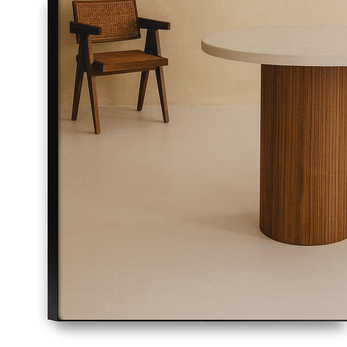 A minimalistic portrait of a table with a classic chair from Pierre Jeanneret in the background.