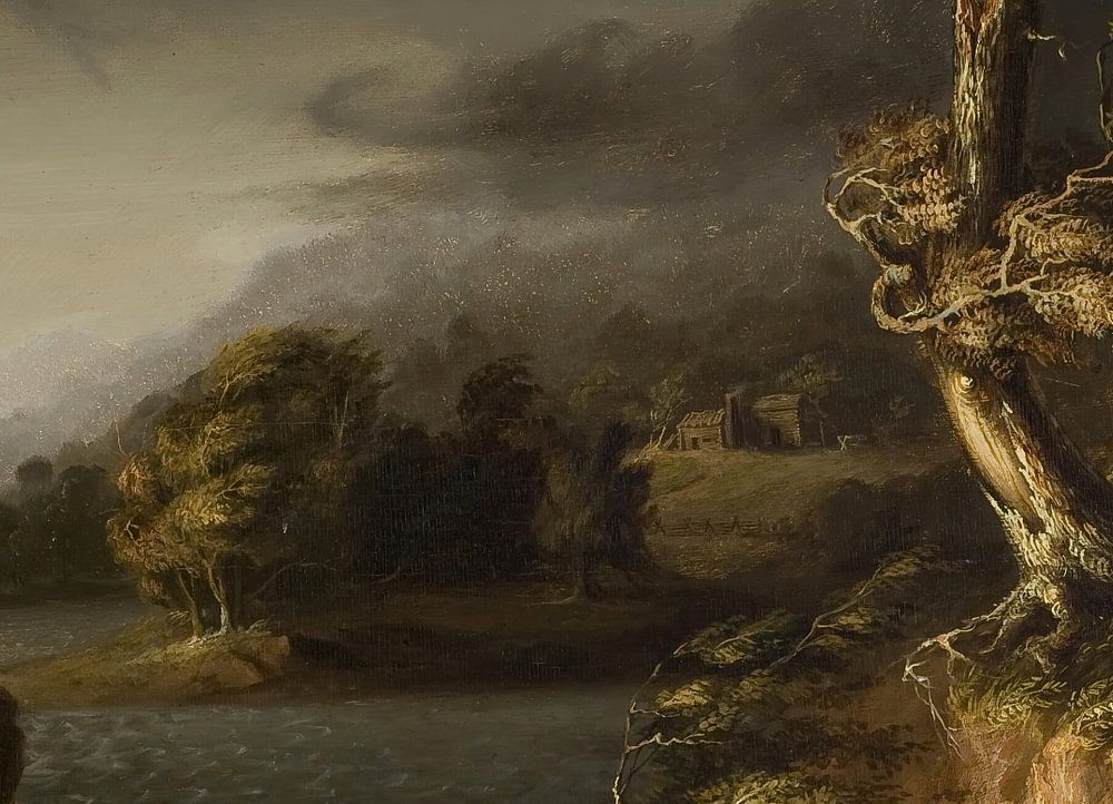 The storm that rages in this early painting by Thomas Cole is a natural counterpoint to the overwrought emotions of the swooning, perhaps dying, woman in white. Here, Cole likely illustrates a frontier drama he authored in 1825. His emphasis on the “sublime and beautiful”—dimensions of nature thought to parallel human emotions—was a popular convention. Cole claims this scene as uniquely American: a modest homestead, likely of pioneers, stands humble and isolated in a wild landscape.