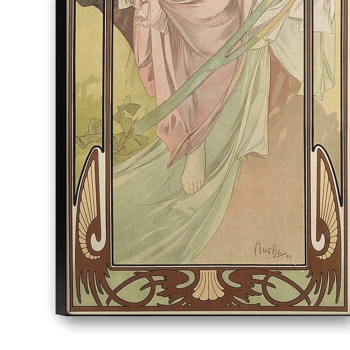 In this series, Mucha expressed the mood of four times of the day with the figures of four women. Each woman’s pose and the seasonal landscape in the background—Morning with spring; Daytime with summer; Evening with autumn; Night with winter—reflect her mood.