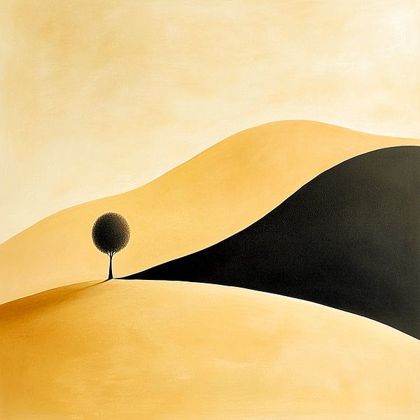 Minimalist and harmonious artwork of a single dark tree on a rolling sand hill that perfectly captures the balance between warm light gold and deep black shadow - ideal as a zen and balanced wall decoration.