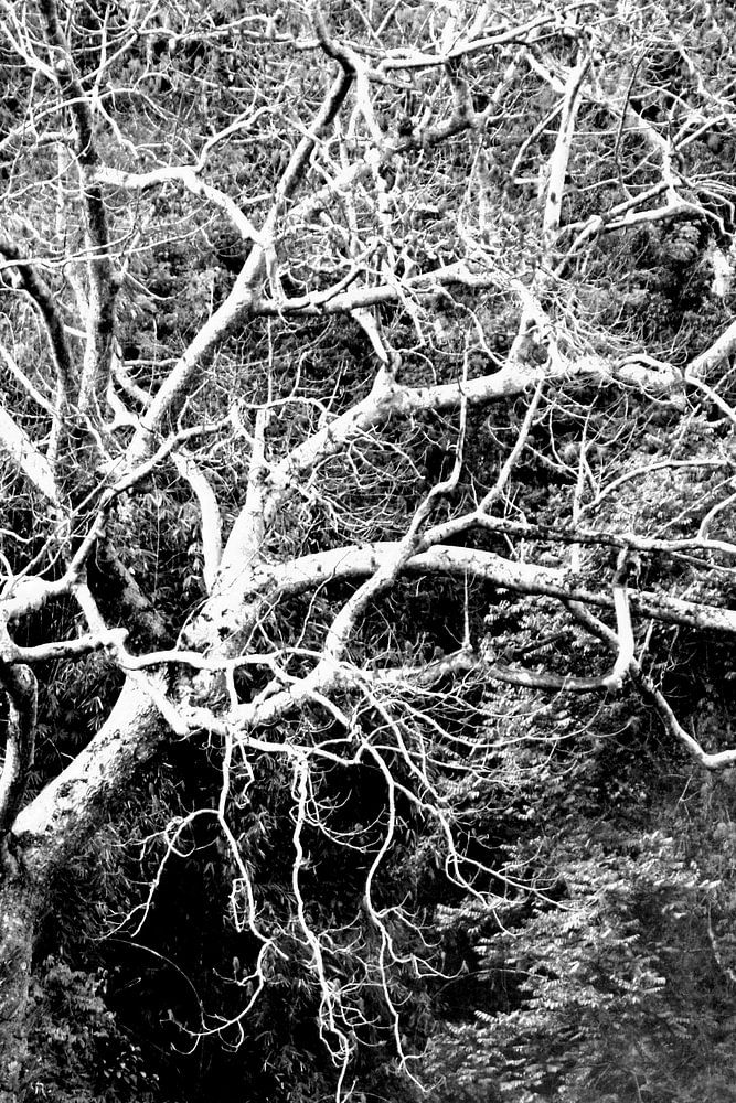 On the banks of the Vang Vieng river, this solitary tree evokes strength and resilience. Its complex structure, captured in black and white, tells the story of a vibrant ecosystem, contrasting with the serenity of the surrounding waters.
