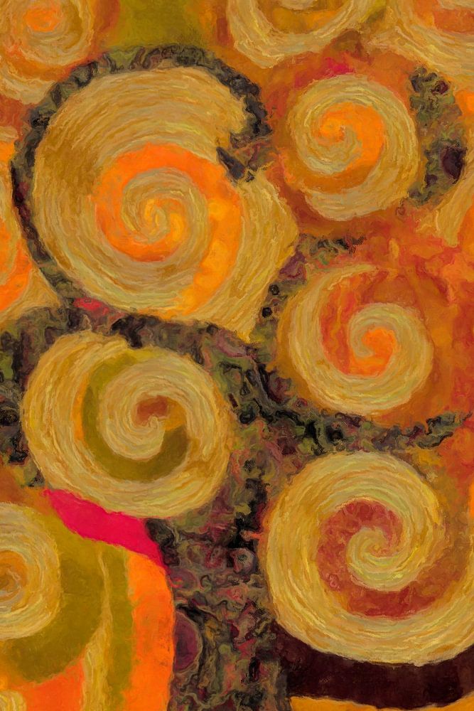 The work depicts a tree whose branches unfold in large spiral shapes. The crowns consist of overlapping circular movements in shades of orange, red, gold and ochre. The spiral patterns fill almost the entire plane, giving the tree a monumental presence.