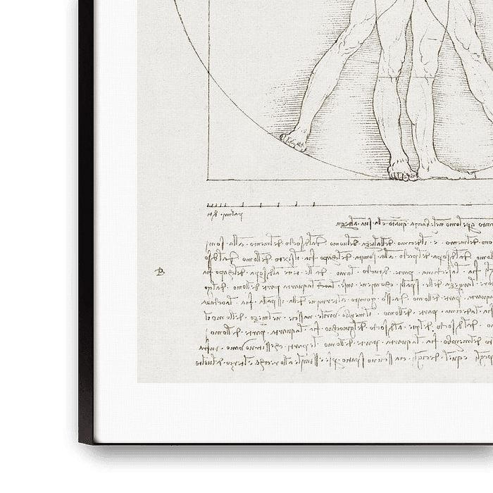 The circle and square, intertwined with the human figure, symbolise the cosmic connection between the microcosm of man and the macrocosm of the universe. Every detail, from the spread arms and legs to the precisely balanced proportions, testifies to Da Vinci's profound understanding of both the arts and sciences.