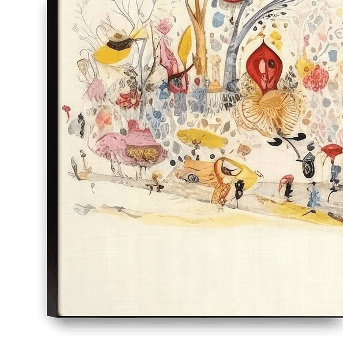 This artwork is a vibrant and joyful representation of an imaginative world where the boundaries between nature and the playful lives of its inhabitants are blurred.