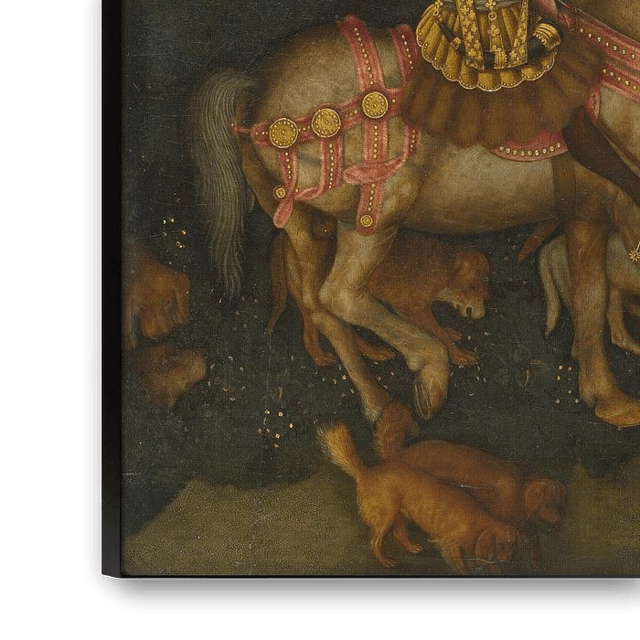An elegantly dressed huntsman has been stopped in his tracks by an apparition: a large stag with a Crucifix between its antlers. This is Saint Eustace, a Roman soldier who, while out hunting one day, had a vision of a stag with Christ on a shining cross between its antlers. He converted to Christianity at once.