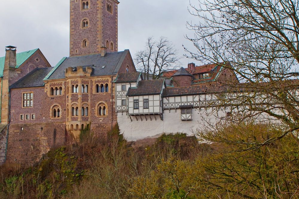 Wartburg Castle is a castle in Thuringia, located above the town of Eisenach at the northwestern end of the Thuringian Forest 411 m above sea level. It was founded around 1067 by Louis the Knight and has been a UNESCO World Heritage Site since 1999.