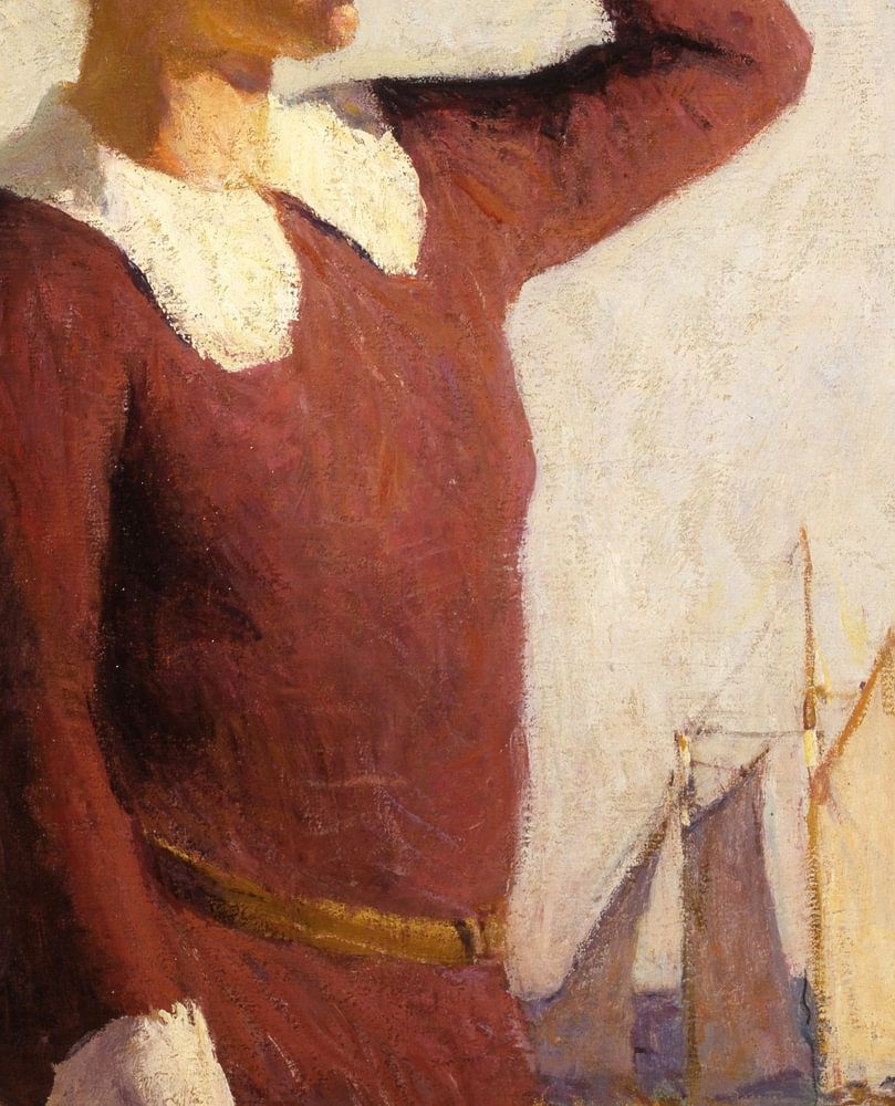 Frank Weston Benson's portrait of his youngest daughter, Sylvia, is one of the last known plein air paintings he executed of his family members on the hillsides and slopes around their summer home in Penoboscot, Maine. Clearly evident here is Benson's mastery of the light. Sylvia shields her eyes from the sun (a classic Benson pose for his models) as she gazes out across the bay. The light has a powerful effect on the features of the canvas. The sails on the ship, the water in the bay and the ground on which Sylvia stands are all suffused in light, and shadow. The contrast between the two creates a marvelous rendering of the dramatic impact direct sunlight has on subjects. The subject matter of this, and many other individual and group paintings that Benson did, is gentle and refined.