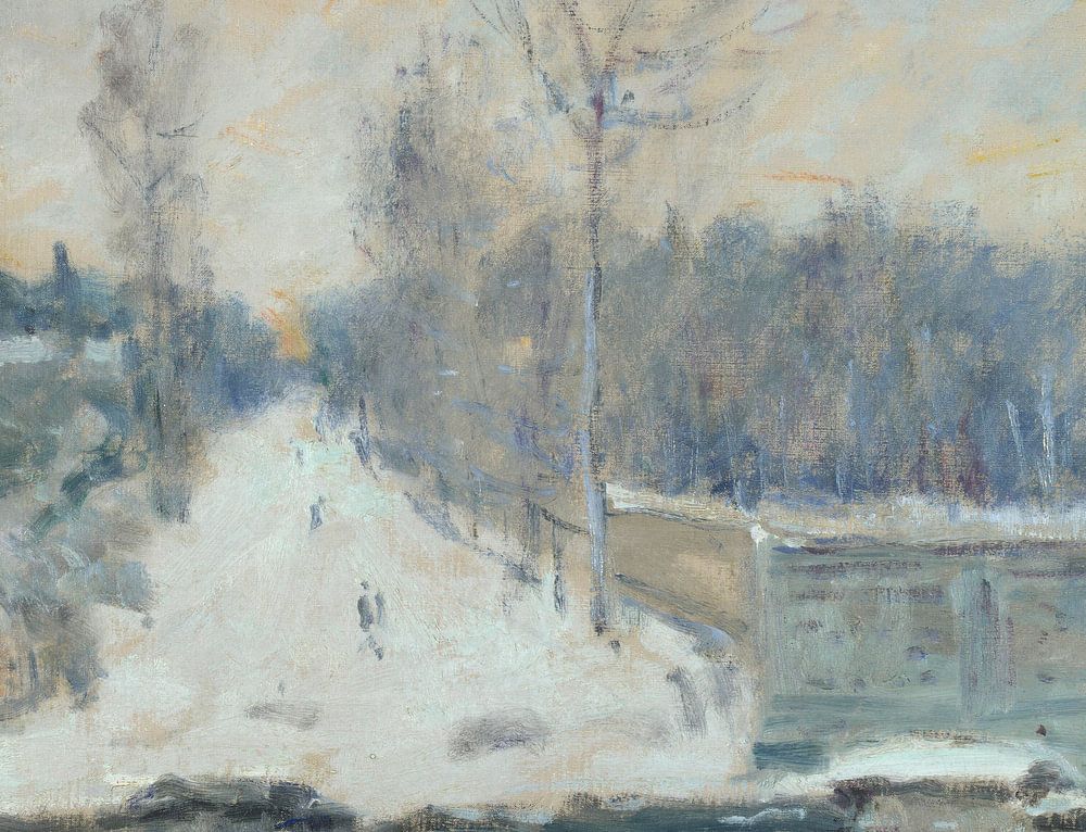 Sisley painted this winter scene in the small village of Marly-le-Roi in early 1875, soon after he moved there. The village was the site of the Château de Marly, which had been built in the late seventeenth century for Louis XIV, King of France, as a retreat from Versailles. It was later demolished. The watering place in the foreground of the picture was one of the last remnants of the château’s grand water gardens. Sisley lived very close by and painted almost 20 pictures that include it.