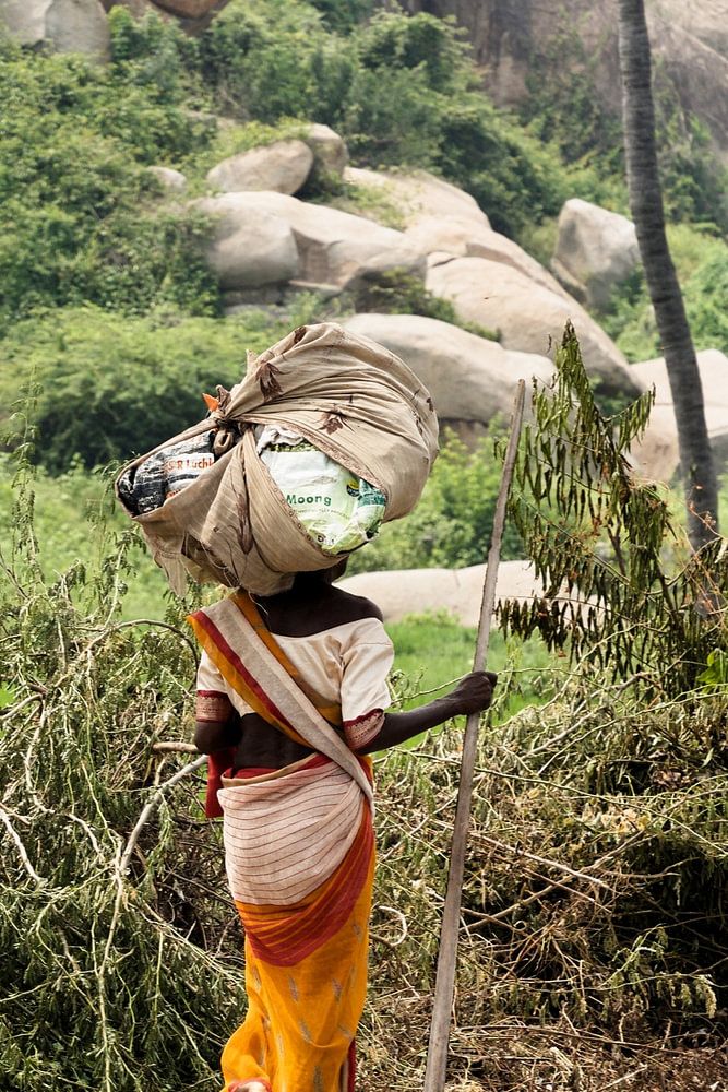 An Indian woman, captured in all her grace, strides confidently forward while carrying an imposing bundle on her head. The gesture, at once habitual and impressive, testifies to the resilience and strength of the region's women.