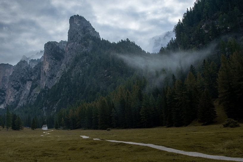 A lone chapel stands at the foot of the imposing Dolomites, as the morning mist sweeps through the pine forest like a blanket. An image that captures the futility of man versus the raw power of nature.