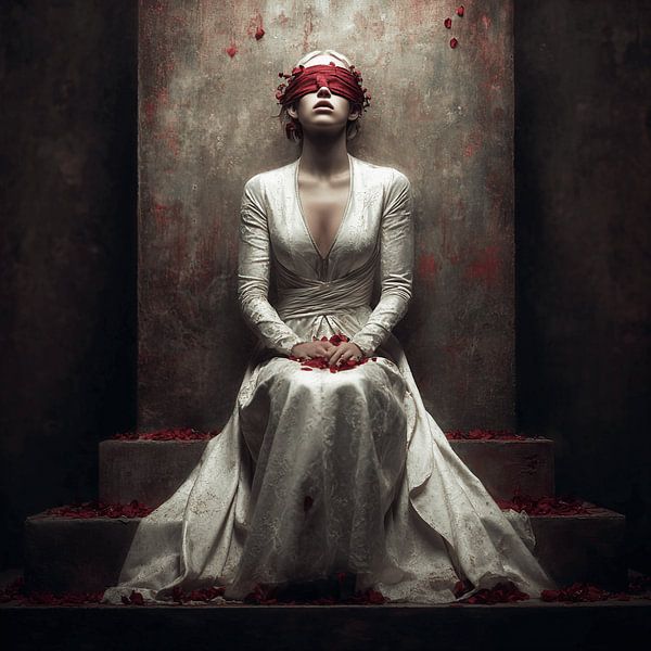 Buy this portrait The White Bride on the Throne - Submission with Roses by Karina Brouwer on canvas, ArtFrame, poster and wallpaper, printed on demand in high quality.