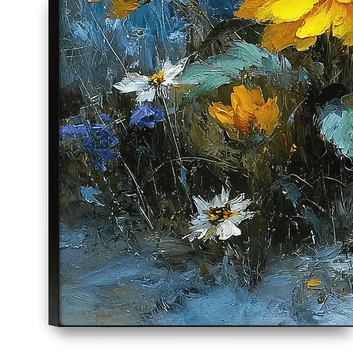 This radiant artwork, The Yellow Wagtail in the Winter Sunflower Field, shows a small blue bird sitting peacefully among tall sunflowers and other wildflowers,…