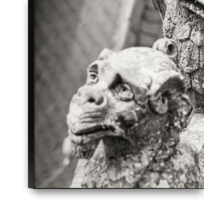 The air arch statues or spouts of St. John's Cathedral in 's-Hertogenbosch, stone figures represented sitting astride, mostly on the upper air arches of the cathedral. Black and white version.