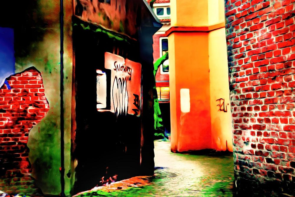 The alley An alley in the city, impoverished and almost forgotten with garbage dumped in the corner. By playing with light I tried to give it a colorful oil painting look. This gave it an artistic touch. The colours can be intriguing and make the alley lively and captivating.