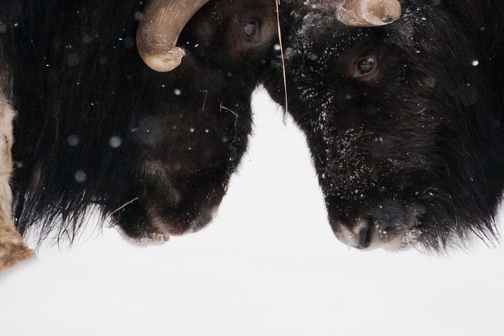 The battle of the bulls, the fight (butting) close-up. Ice horned polar relic beast of the ice age hairy musk ox beast on winter snow.
