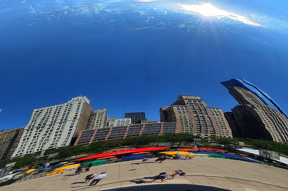 This bean (The Bean; Cloud Gate; mirror ball) is a work of art by British artist Anish Kapoor. It is the eye-catcher at AT&T Square in Millennium Park in Chicago. The photo was taken on 7 August 2019.