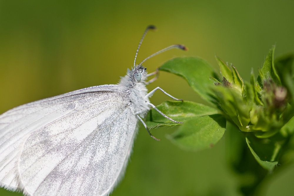 The woodwhite in its beautiful green surroundings hanging from a flower.