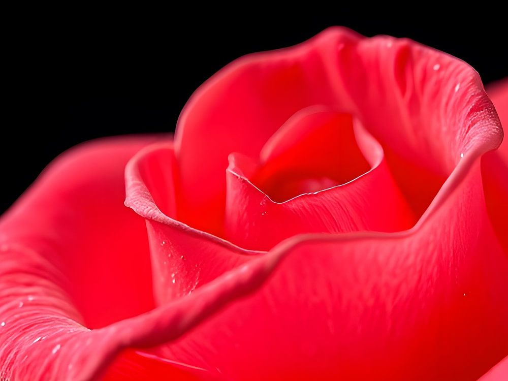 The picture shows a red rose against a black background. The petals of the rose are detailed and vibrant, with fine textures and a rich red colour. The rose is in full bloom and the curved petals give it an elegant and graceful appearance. The contrast between the bright red rose and the deep black background makes the flower stand out and emphasises its natural beauty.