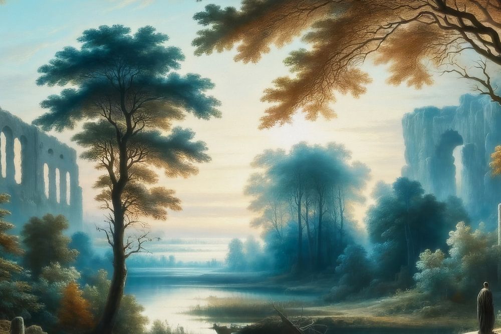 Compositionally, the picture is framed by the majestic trees, which tower like silent sentinels over the forgotten ruins and lend depth to the scene. The lone wanderer on the banks of the river acts as a subtle centrepiece, connecting the viewer to the human world while reinforcing the feeling of loneliness. The placement of the walker emphasises the grandeur and majesty of nature in contrast to the fragility of the human presence.